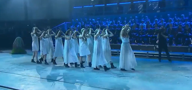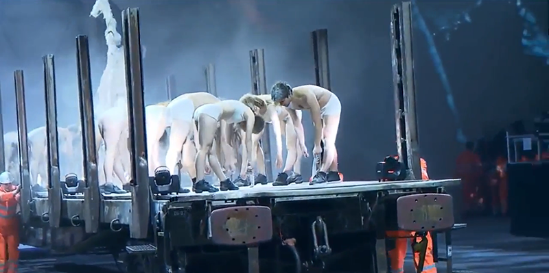 Depois de retratar os trabalhadores como soldados zumbis, a cerimônia retrata a população em geral, como um grupo de pessoas lascivas que parecem ser extremamente sugestionáveis.
