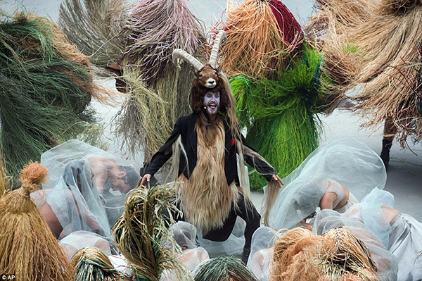 O homem cabra faz a sua entrada, acompanhado por pessoas vestindo véus brancos … como noivas antes de um casamento.