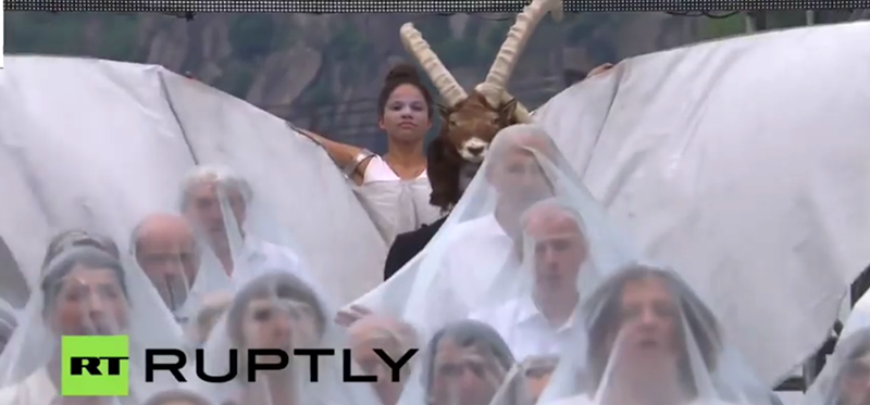 O que isso tem a ver com a construção de um túnel? Os  meios de comunicação, em suas tentativas  para explicar esta cerimônia, dizem que há cabras da montanha nos Alpes … o que explica a cabra-homem. Mas porque é que este cabra-homem está em tal posição de poder? Porque as pessoas estão se curvando diante ele?
