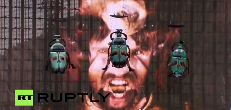 Enquanto o homem bode corre pelo palco, gritando como um homem possuído, uma grande tela exibe imagens da do homem cabra . Três escaravelhos flutuam na frente dele.